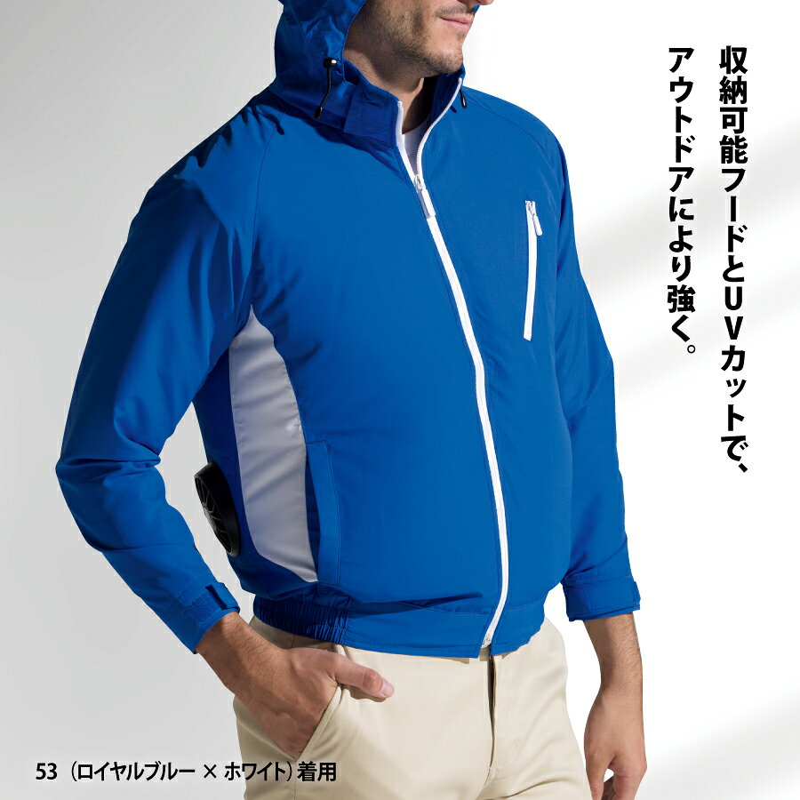 収納可能なフード付きとUVカット素材を使用することで、ソフトワークからレジャー・アウトドアにも適した長袖タイプの2022年空調風神服セット。