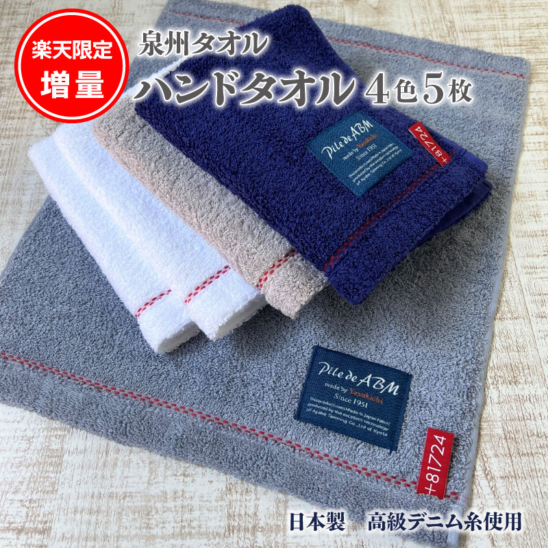【ふるさと納税】楽天限定 期間限定 タオル ハンドタオル 5枚 セット ホワイト ブルーグレー ネイビー グレー 増量提供 日本製 高級デニム糸使用 泉州タオル 綿100% 使い込むほど味が出る 日用品 お取り寄せ お取り寄せギフト Pile de ABM +81724 送料無料 泉佐野市