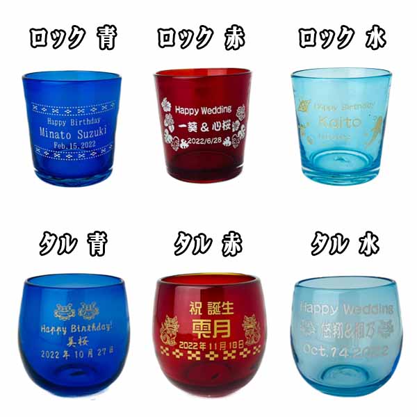 商 品 詳 細 商品名 名入れ専用グラスの名入れ 種類とカラー タルグラス 青タルグラス 水タルグラス 赤ロックグラス 青ロックグラス 水ロックグラス 赤 刻印文字色 ゴールド・シルバー 材質 ソーダガラス 重量 タルグラス約180gロックグラス約240g 容量 タルグラス約280ml(満杯時)ロックグラス約310ml(満杯時) サイズ タルグラス 高さ:約8.0cm 口径:約7.0cmロックグラス 高さ:約8.5cm 口径:約8.5cm 製法 吹きガラス製法によるHAND MADE製品 生産地 中国(※日本国内食品検査済) HAND MADEガラス製品について 当店のガラス製品は1点1点手作りで作られています。
